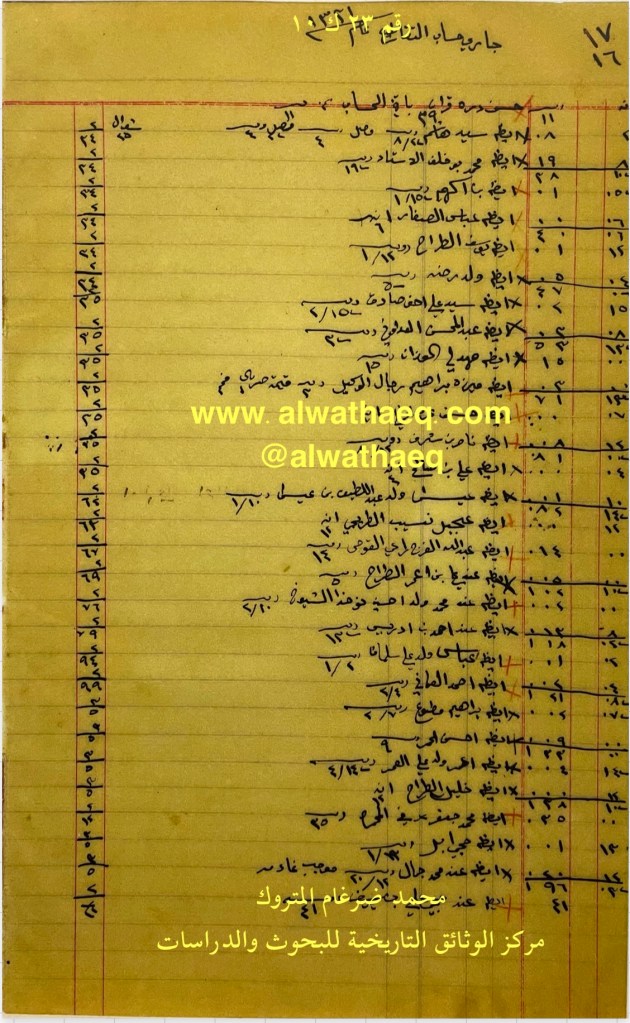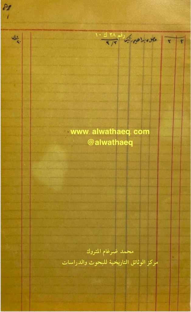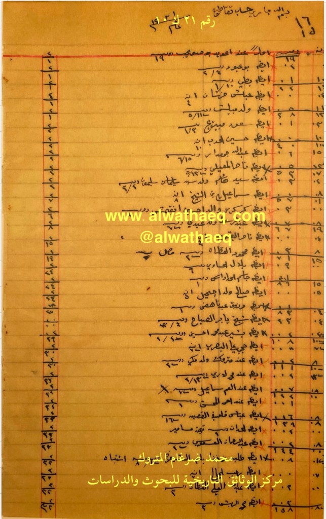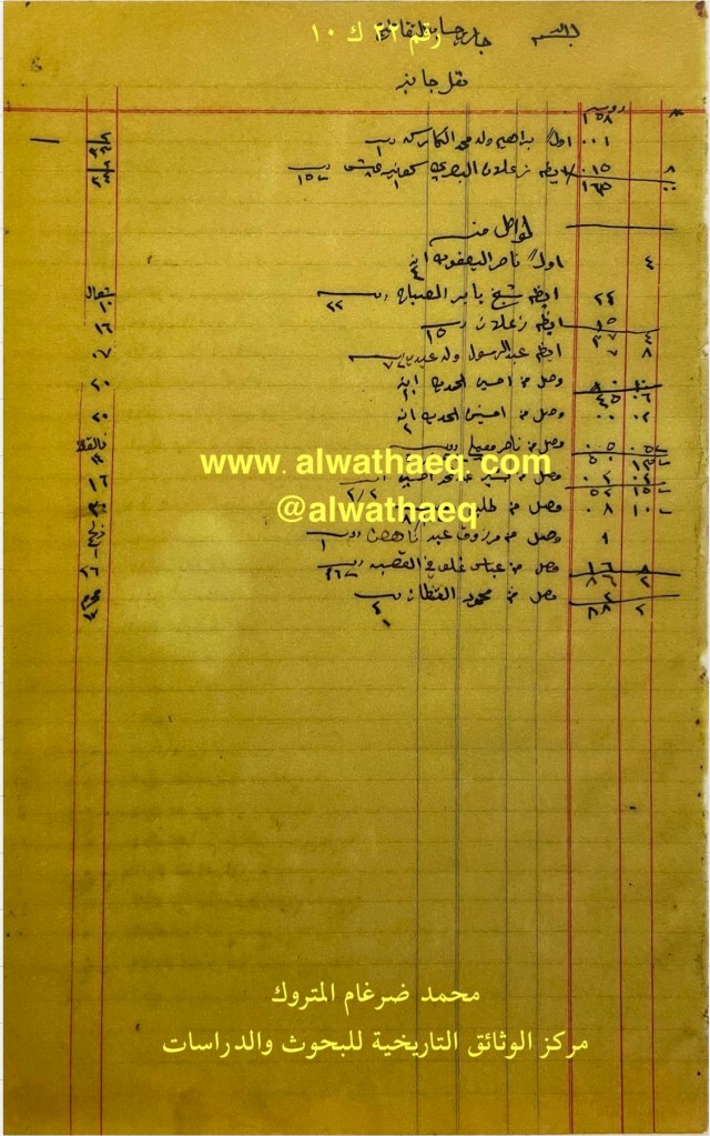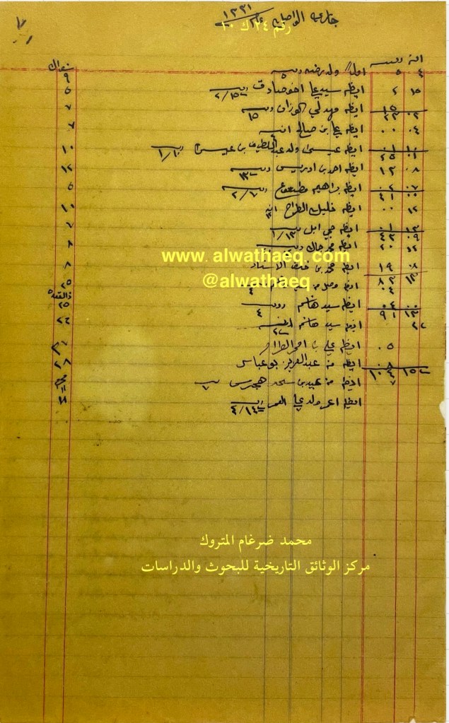 كشف حساب سنة ١٩١٣ م من دفاتر التاجر محمد بن عبدالله المتروك الاسماء التي ذكرت🚩: ولد رضا / سيد علي اخو صادق / مهدلي الوزان / علي بن صالح / عيسى ولد عبداللطيف بن عيسى / احمد بن ادريس / ابراهيم مطوع / خليل الطراح / حجي ابل / محمد جمال / محمد بن خلف الاستاد / سيد هاشم / علي بن عمر الطراح / عبدالعزيز بوعباس / عبيد بن هجرس / عمر ولد علي العمر من البضائع والمعاملات التي ذكرت 🚩: جاري الواصل عام ١٣٣١هـ ( استلام مبالغ نقدية ) العملات المتداولة🚩: ربيه / آنه وثيقة رقم ( ٢٤ ك ١٠ )🚩: . ✏️شرح وتعليق / محمد ضرغام المتروك . الوثائق التاريخية للبحوث والدراسات