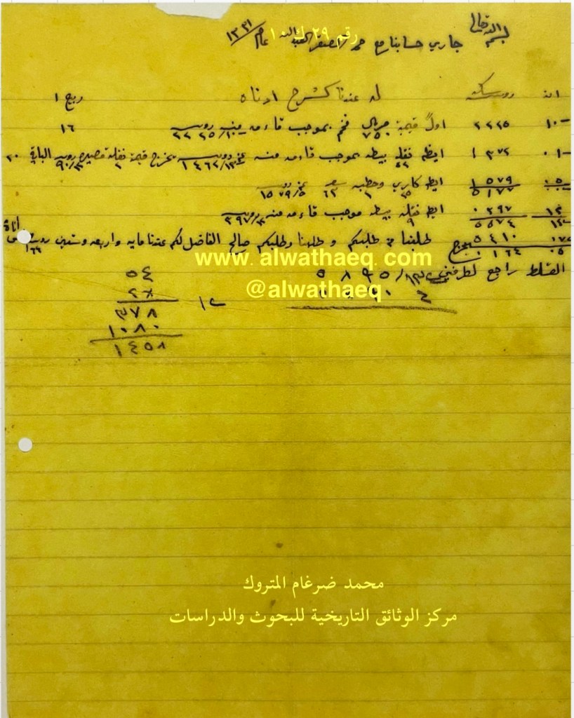 كشف حساب سنة ١٩١٣ م من دفاتر التاجر محمد بن عبدالله المتروك الاسماء التي ذكرت🚩: حمد الصقر العبدالله ( الصقر ) الاماكن التي ذكرت🚩: من البضائع والمعاملات التي ذكرت 🚩: ٧٥٠ صربال فحم / ٥٢ نقلة بيطه قائمه منه عن ١٤٦٢/١٣ ربيه / ٢٥ كاري و ٢ حطبه / ٩ نقله بيطه / القلط راجع للطرفين ٥٨٩٥/١٣ ربيه العملات المتداولة🚩: ربيه / آنه وثيقة رقم ( ٢٩ ك ١٠ )🚩: . ✏️شرح وتعليق / محمد ضرغام المتروك . الوثائق التاريخية للبحوث والدراسات