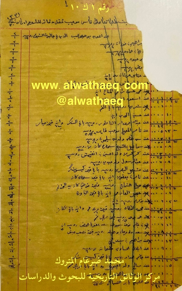 كشف حساب سنة ١٩١٣ م من دفاتر التاجر محمد بن عبدالله المتروك الاسماء التي ذكرت🚩: صالح فضاله / ابراهيم القديفي / سيد سليمان / زعيل بن رومي بحار بن عويد / عبدالله بن حسن / سعيد العطيبي / راشد ولد ابراهيم برشود ( الرشود ) / محمد بن حرفان / علي العيمي / سعد اخو ناهض / مچيمي ( المكيمي ) / سعد الحمّار / صالح بن يوهر ( جوهر ) / عبدالله السليمان / عبدالله اخو وحيد البناي / عبداللطيف بن خميس / بن حكان ( بن حقان ) / سعود المديرس / عجيل / محمد مبارك مضحج / حجي علي بن يوسف البحراني / حسن بن عبدالرزاق / علي ولد مالچ ( مالك ) / عبدالله الفرج راعي الغوص / مهلهل الياسين / عمر ولد عثمان بن سري / احمد الفرحان / علي بن عمر الطراح / خالد بن ياكوت ( الياقوت ) / صالح المناعي / احمد بوهناد / التويجري / محمد الموسى من البضائع والمعاملات التي ذكرت 🚩: ودك / باوره / نوره / كنبار / ساكو / اسلام مبالغ نقدية العملات المتداولة🚩: ربيه / انه ملاحظة🚩: محمد مبارك مضحچ قد يكون المقصود ب ( مضحچ ) المضاحچة ( المضاحكة ) وثيقة رقم ( ٧ ك ١٠ )🚩: . ✏️شرح وتعليق / محمد ضرغام المتروك . الوثائق التاريخية للبحوث والدراسات