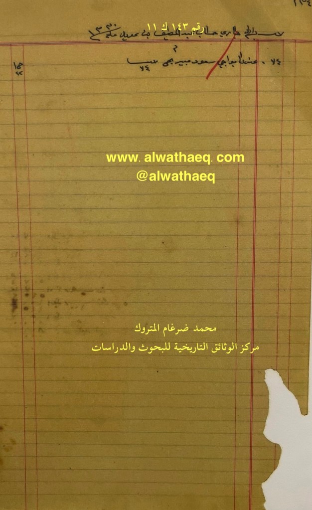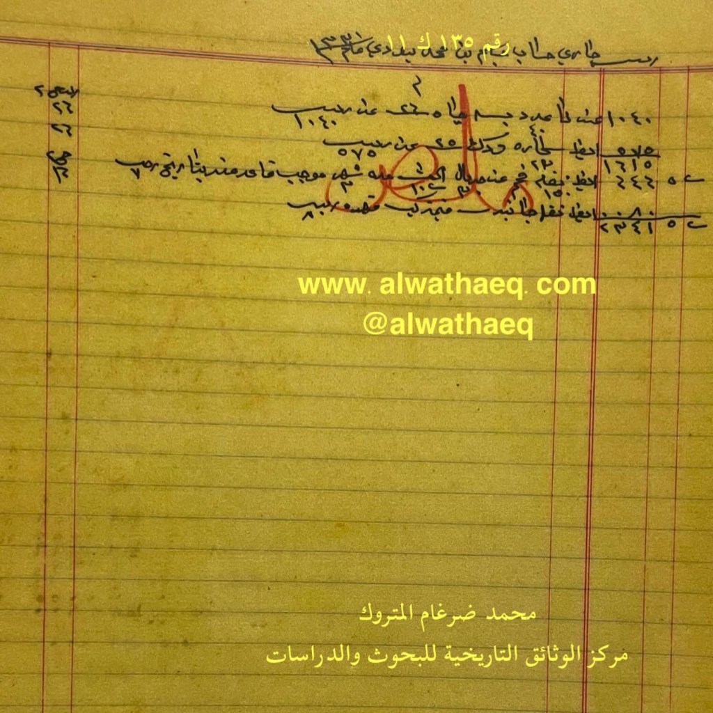 كشف حساب سنة ١٩١٢ م من دفاتر التاجر محمد بن عبدالله المتروك الاسماء التي ذكرت🚩: عبداللطيف بن عويد / سعود مبيريج ( مبيريچ ) من البضائع والمعاملات التي ذكرت 🚩: ٧٤ ربيه بواجي سعود مبيريج العملات المتداولة🚩: ربيه وثيقة رقم ( ١٤٣ ك ١١ )🚩: . ✏️شرح وتعليق / محمد ضرغام المتروك