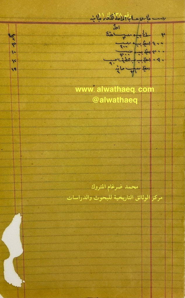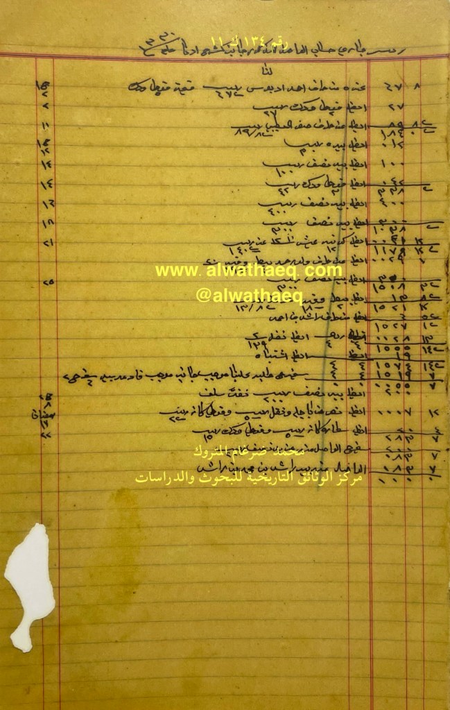كشف حساب سنة ١٩١٢ م من دفاتر التاجر محمد بن عبدالله المتروك الاسماء التي ذكرت🚩: عبداللطيف بن عثمان من البضائع والمعاملات التي ذكرت 🚩: ٦٥ بيطه و ٥ قندي النور و ٢ قندي شوكان / ٣٠ بالوص شوكان العملات المتداولة🚩: ربيه / آنه وثيقة رقم ( ١٣٧ ك ١١ )🚩: . ✏️شرح وتعليق / محمد ضرغام المتروك . الوثائق التاريخية للبحوث والدراسات
