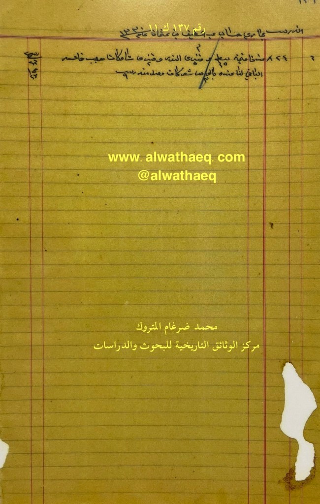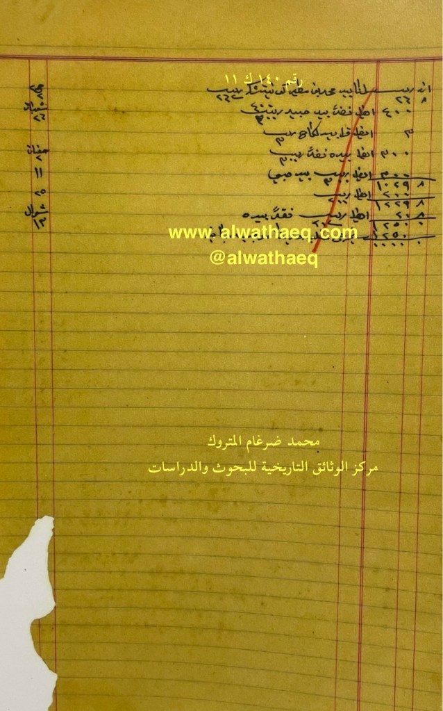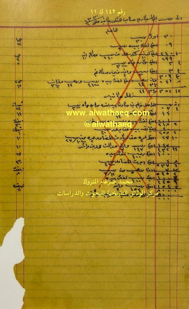 كشف حساب سنة ١٩١٢ م من دفاتر التاجر محمد بن عبدالله المتروك الاسماء التي ذكرت🚩: محمد بن مطير / عبدالله الساير من البضائع والمعاملات التي ذكرت 🚩: عدد ١٠٠ كونيه عيش / ١٠٠ كيس شكر العملات المتداولة🚩: ربيه وثيقة رقم ( ١٣٩ ك ١١ )🚩: . ✏️شرح وتعليق / محمد ضرغام المتروك . الوثائق التاريخية للبحوث والدراسات