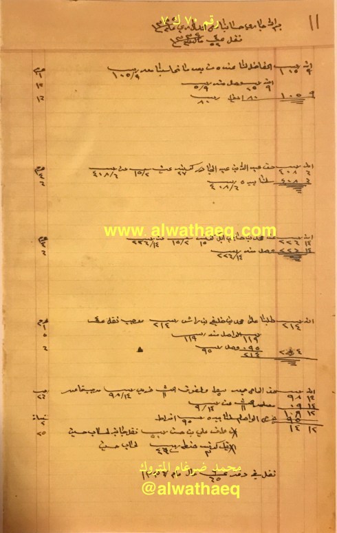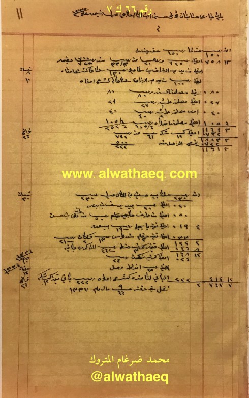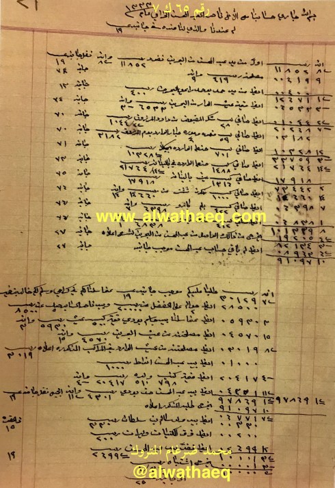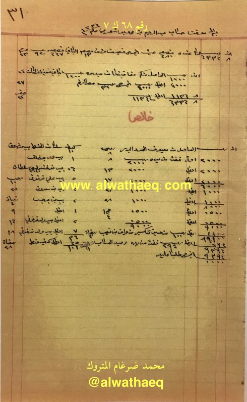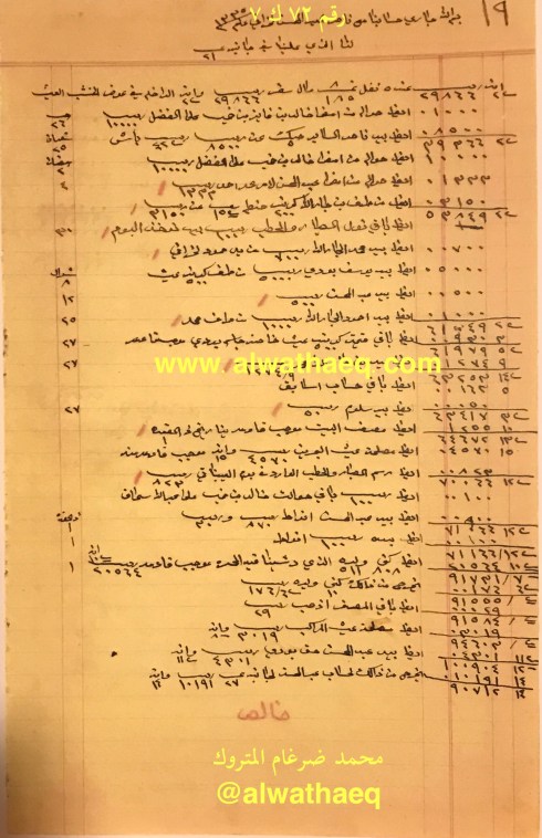جاري حسابنا مع الاخ ناصر العبدالمحسن الخرافي له عندنا والذي لنا عنده / من يد عبدالمحسن من البحرين ١١٨٥٢ ربيه و ٨ انه و ٢ بيزه / من يد حمد بوحمد راعي البحرين ٤٠٠ ربيه / قيمة العيش الوارد من البحرين / صافي شكر المقبوض من داود المرزوق / صافي قهوة و ٤ موره صبار الوارد من بوم المرزوق / حنطه الوارد بجيكلا / صافي ١٤٨٨ كيس حنطه الوارد في بالينانه / ١٠٠٠ كيس رنكون ششتر / ٤٢٢ كيس بلم بارو / ٤١٢ كيس حنطه بارو / ٣٠١٢٩ ربيه ٧ انه ٢ بيزه طلبنا عليكم موجب جنابه نمره ١٩ عنها سلمنا لكم في كراتشي وسلم لكم خالد بن خميس / ٢ حواله على الفضل ٢٠٠٠٠ ربيه وبيد ناصر الساير ٨٥٠٠ ربيه / بيد جاسم بودي قيمة ٥٠٠ كيس عيش / مصلحتنا من عيش البحرين ٤٥٧٠ ربيه و ١٥ انه / مصلحتنا من عيش الوارد في المراكب المذكوره أعلاه ٣٠١٩ ربيه / بيد عبدالمحسن انواط ١٠٠٠ ربيه / فرق الكنيات و ليرات ٢٠٠ ربيه