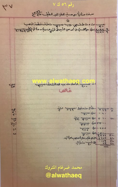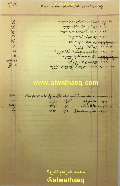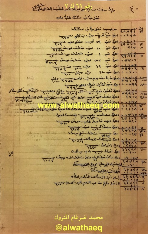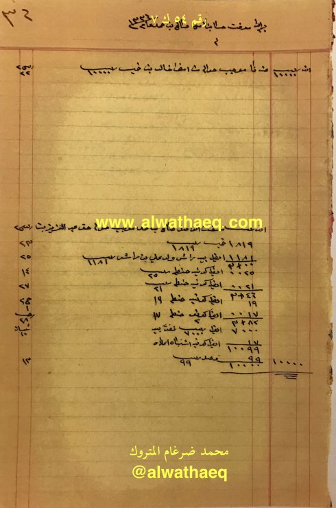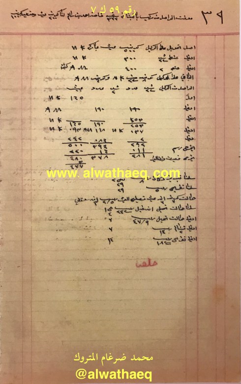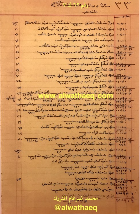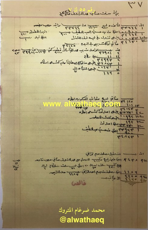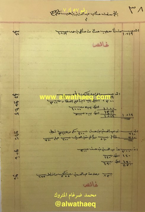 ٤ كونيه حنطه مال العسعوسي / خسارة بوم العسعوسي / ١٩٥ كونية شعير / من طرف بن فليج قيمة ١٣٢ كونية عيش ٢٨٧١ ربيه / ٣٢ كونيه المبتاعه على بن كاظم / خسارة بن فليج / مصلحة دويري وسيد علي ٥٠٠ ربيه / كونيه عدس / قوطي ودج / حلوه / مصلحة بن جارالله وبوم الخرافي ١٨٩٨ ربيه / باقي كنبات شاهين / ٤٠ كونيه عيش حلوه بيد احمد بن سالم الخشتي ٧٥٠ ربيه / كونيه رنكون ٢٤ ربيه بيد راشد بن سلامه / ٩٠٠ ربيه من طرف عبدالله الخالد