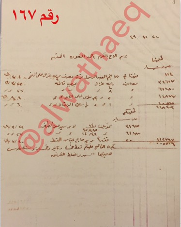 طلب الحاج محمد المتروك على حسين العبدالله جمال وهو عبارة عن كشف حساب من سنة ١٩٠٩م الى ١٩١٢ م ومن هذه الطلبات التي على حسين جمال مواد غذائية واستهلاكية