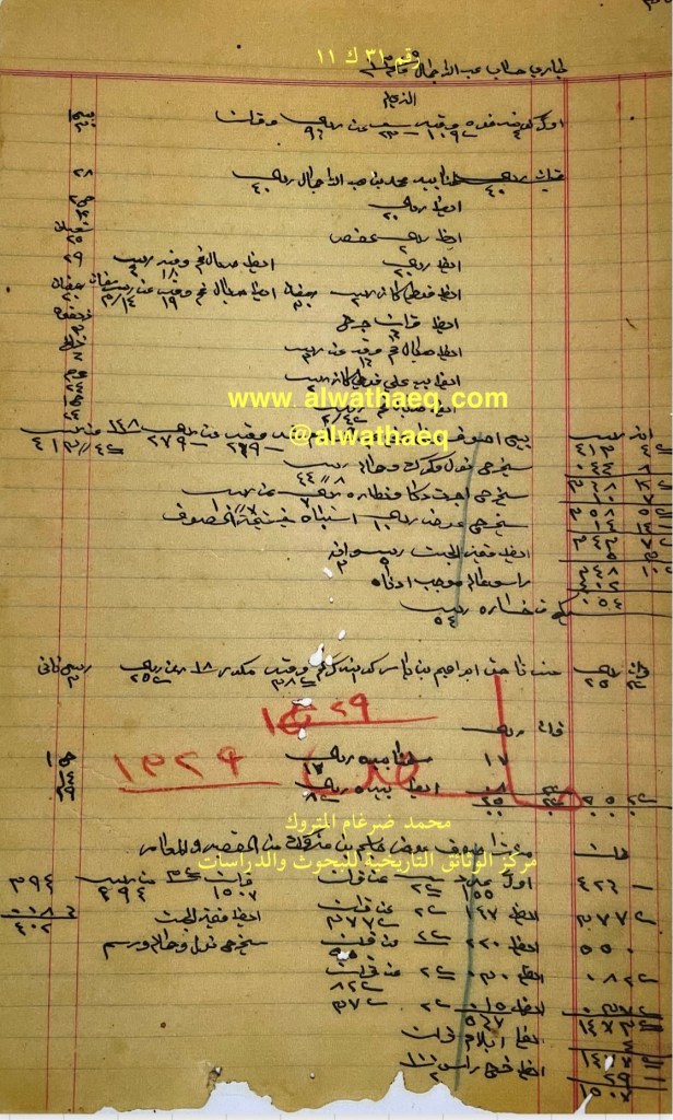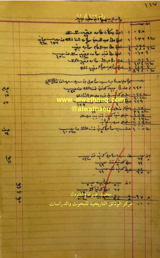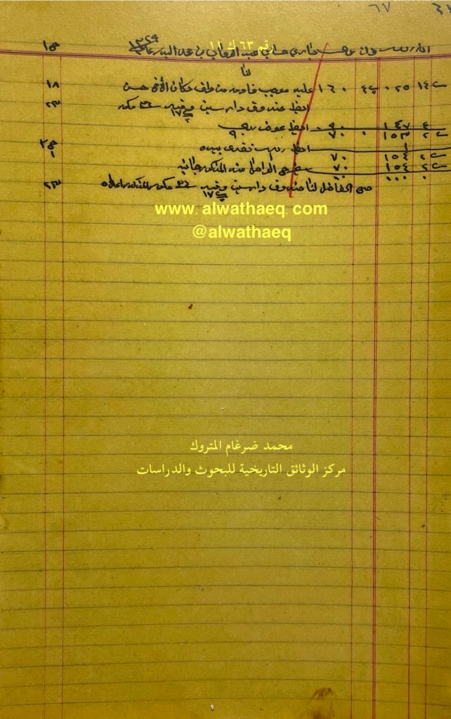 كشف حساب سنة ١٩١١ م من دفاتر التاجر محمد بن عبدالله المتروك الاسماء التي ذكرت🚩: جاسم بن سلمان بن نصف / طويك ( طويج ) / سيد علي اخو سيد صادق الاماكن التي ذكرت🚩: الدكان / البيت من البضائع والمعاملات التي ذكرت 🚩: ٢٣ موره من دكان على طويك ومن البيت ٤ موره / ١٠ كونيه زهر العملات المتداولة🚩: ربيه وثيقة رقم ( ٧٦ ك ١١ )🚩: . ✏️شرح وتعليق / محمد ضرغام المتروك . الوثائق التاريخية للبحوث والدراسات