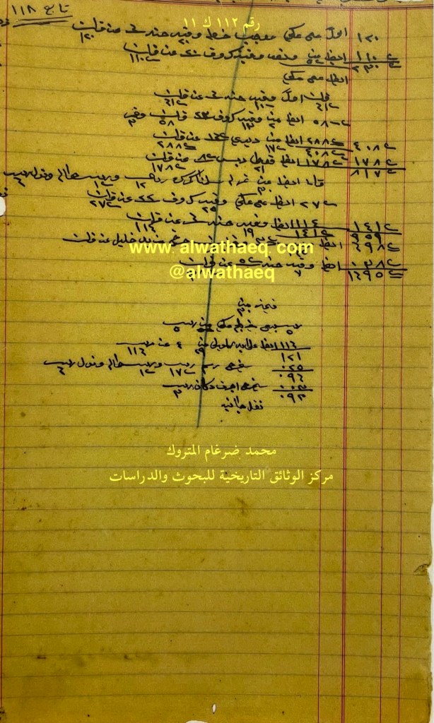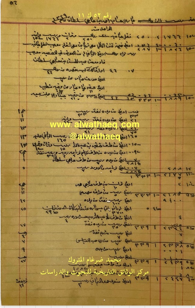 كشف حساب سنة ١٩١١ م من دفاتر التاجر محمد بن عبدالله المتروك الاسماء التي ذكرت🚩: احمد بن حاجي سلطان / عبدالمحسن او ( عبدالحسن ) بن حاجي سلطان / خضير بن عبدالله / جاسم / حاجي سلطان / حاجي محمد / مهدي / ملا عبدالله / حسن دره / عبدالعباس / جويسم / حسين بن شعبان / حمد اليماني الاماكن التي ذكرت🚩: القصبة / الدكان من البضائع والمعاملات التي ذكرت 🚩: قهوه / صبار / چاه / قرابيه / قرابيه ماء ورد / ٣٧٠٠ زباين التي بسجاره عندنا بالدكان العملات المتداولة🚩: آنه / ربيه / قران / ريال / قمري وثيقة رقم ( ٥٢ ك ١١ )🚩: . ✏️شرح وتعليق / محمد ضرغام المتروك . الوثائق التاريخية للبحوث والدراسات