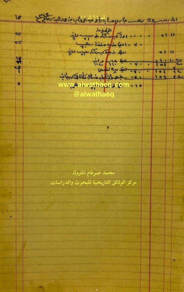 كشف حساب سنة ١٩١١ م من دفاتر التاجر محمد بن عبدالله المتروك الاسماء التي ذكرت🚩: عبدالله جمال / محمد بن عبدالله جمال / علي عبدالسلام / ابراهيم بن ياسر / جاسم بن متروك الاماكن التي ذكرت🚩: القصبه / المعامر / الدكان من البضائع والمعاملات التي ذكرت 🚩: فوه / عقص / فحم / كاز / صوف / اجرة دكان ونطاره / كركم / جت السفن التي ذكرت🚩: اللام العملات المتداولة🚩: ربيه / ريال / قران / انه وثيقة رقم ( ٣١ ك ١١ )🚩: . ✏️شرح وتعليق / محمد ضرغام المتروك . الوثائق التاريخية للبحوث والدراسات