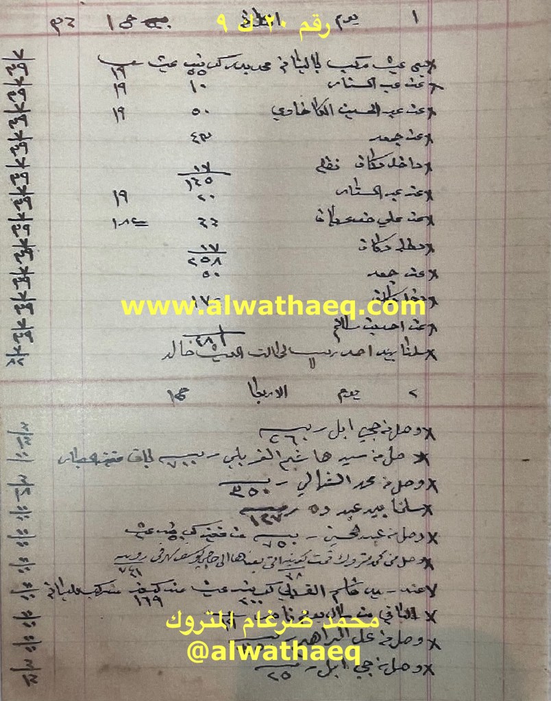 وخاصة في العيش ( الرز ) ومنها الحاج ناصر الخرافي يبلغ الحاج محمد بانه يوجد طلب على العيش بشكل كبير واقيامه مرتفعه اَي سعره ولكن العيش المتواجد قليل ولم يبقى عندهم من العيش للبيع الا قليل وكذلك يبلغ انه بحاجة الى ٤٣ الف ربيه في كراتشي لشراء العيش ويتم بيعها في الكويت و البصرة وكذلك يخبره انه بلغ ولده عبدالمحسن الناصر الخرافي ان يتأمل في بيع العيش وكان آنذاك في البحرين في المكتب التجاري التابع ل المتروك و الخرافي ، كذلك تم ارسال العنيزي ٥٠٠ كيس بلم وهو نوع من انواع العيش
