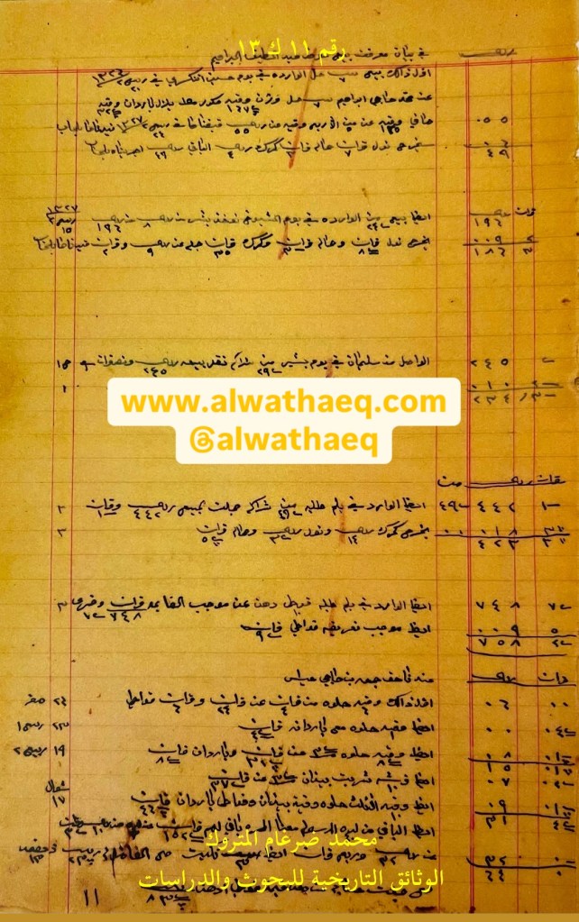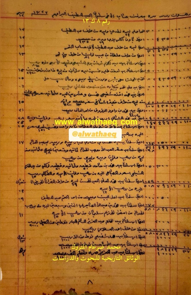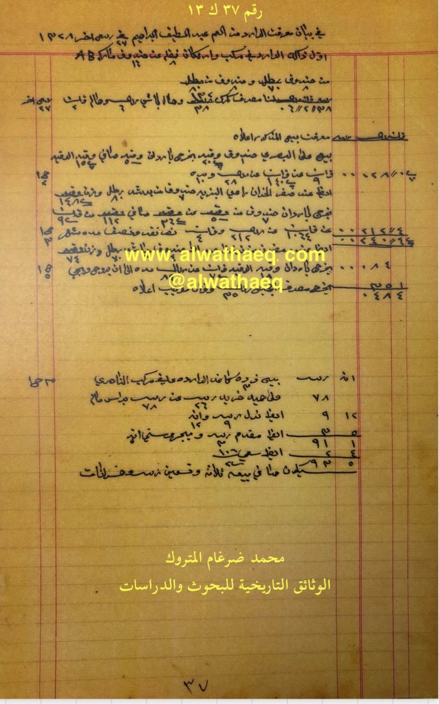كشف حساب سنة ١٩٠٩م – ١٣٢٧هـ من دفاتر التاجر محمد بن عبدالله المتروك الاسماء التي ذكرت🚩: سليمان العبداللطيف الابراهيم / نوخذه سويّد بن جابر معلا / نوخذه خضير / جابر معلا / عبدالرحمن بودي / شيخ حسين الاماكن التي ذكرت🚩: الدكان من البضائع والمعاملات التي ذكرت 🚩: ٣٠٠ كونيه عن ١٥ تقار ١٤٩ كونيه مع نوخذه خضر منه ٦٤ كونيه بغير وزن مشده ٧٩ كونيه الا ثلث نول / كمرك / حماله / اجرة الدكان ونطاره وخمام الدكان ٢ ريال و ٣ قران / حواله / بيد عبدالرحمن بودي ٧٠ ليره / بيد شيخ حسين ٧٠ ليره / سعي ٦٤ كونيه ١٠ ريال / قلطه ٢٠ ليره المرسوم بيد شيخ حسين عن ٢١٣ ريال و ٣ قران السفن التي ذكرت🚩: بلم خضير / بلم جابر معلا العملات المتداولة🚩: قران / ريال / ليره وثيقة رقم ( ١ ك ١٣ )🚩: . ✏️شرح وتعليق / محمد ضرغام المتروك . الوثائق التاريخية للبحوث والدراسات