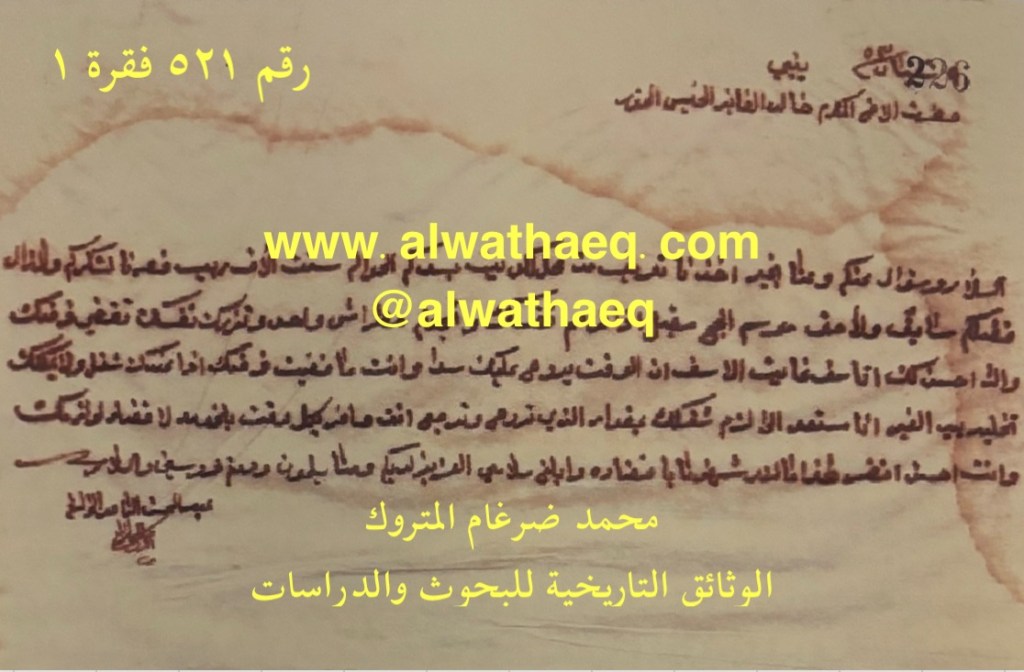 وثيقة رقم( ٥٢١ فقرة ١ )🚩: . ✏️شرح وتعليق / محمد ضرغام المتروك . الوثائق التاريخية للبحوث والدراسات
