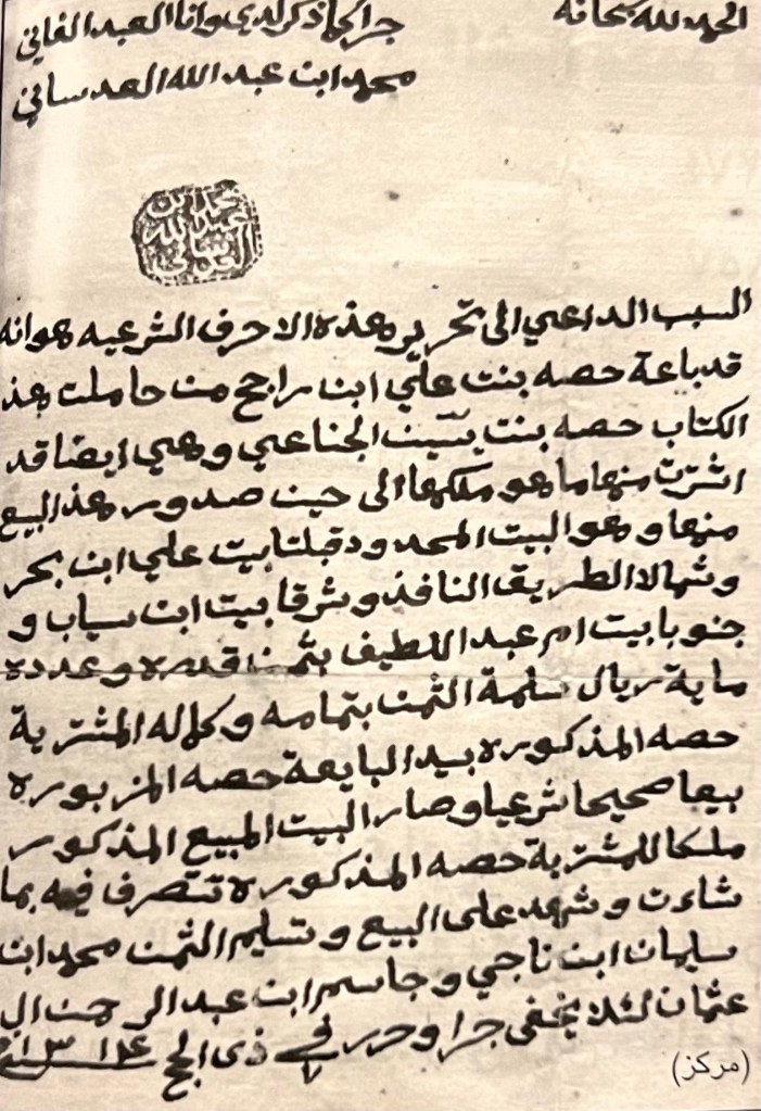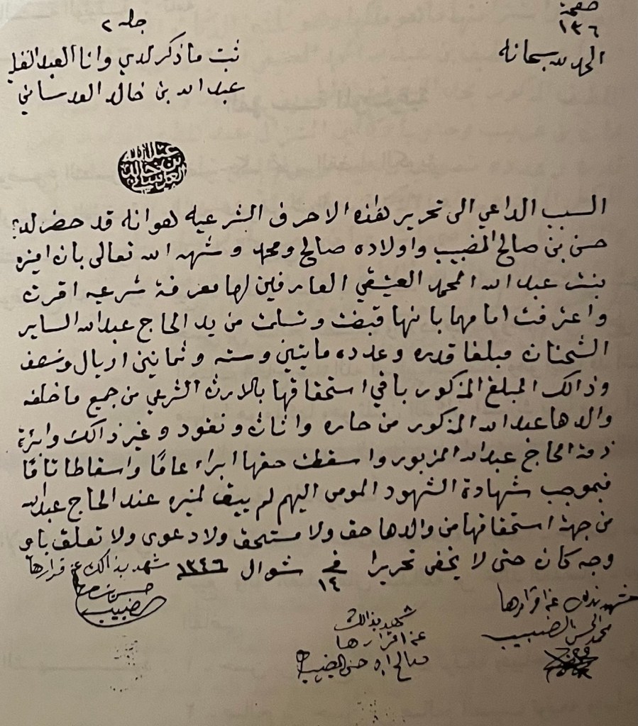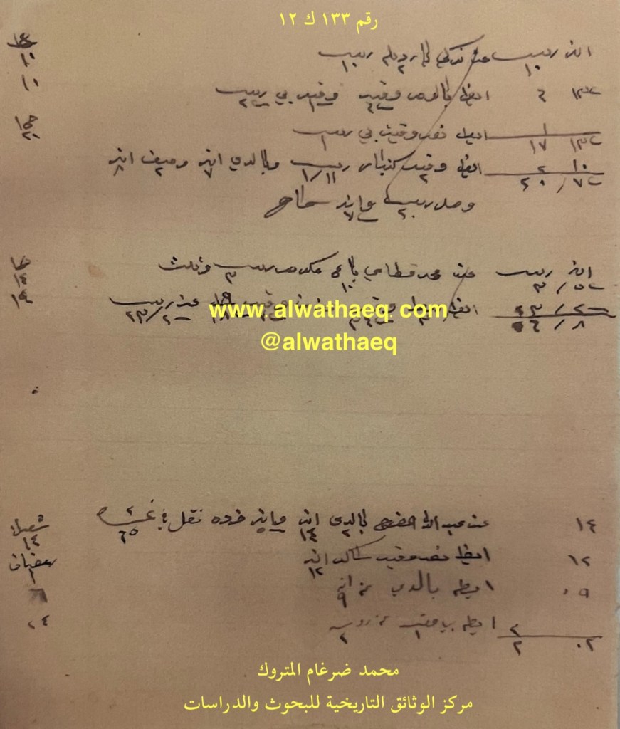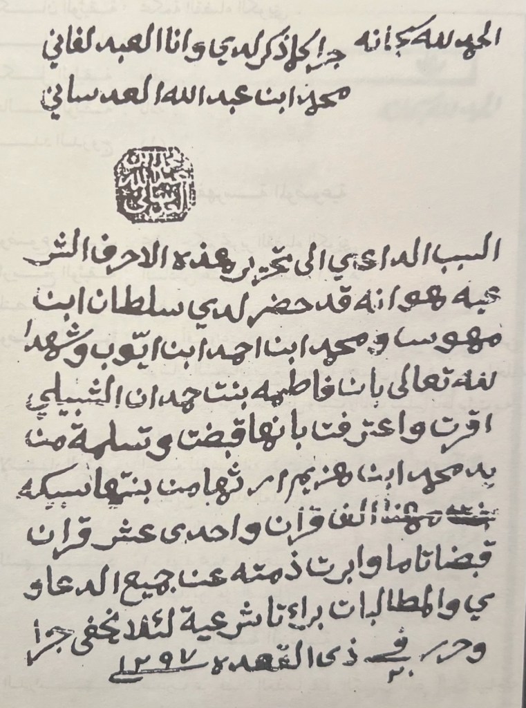 وثيقة عدسانية بتاريخ ٢٠ ذي القعده ١٢٩٧ هـ – – ٢٣ / ١٠ / ١٨٨٠م نص الوثيقة : الحمدلله سبحانه جرا كما ذكر لدي وانا العبد الفاني محمد بن عبدالله العدساني السبب الداعي الى تحرير هذه الأحرف الشرعية هو انه قد حضر لدي سلطان بن مهوس ومحمد بن احمد ابن ايوب وشهدا الله تعالى بان فاطمه بنت حمدان الشبيلي اقرت واعترفت بانها قبضت وتسلمت من يد محمد بن هزيم ارثها من بنتها سبيكه بنت مهنا الف قران واحدى عشر قران قبضا تاما وابرت ذمته عن جميع الدعاوي والمطالبات براءة شرعية لألا يخفى جرا وحرر في ٢٠ ذي القعده سنة ١٢٩٧هـ ✍️شرح : محمد ضرغام المتروك