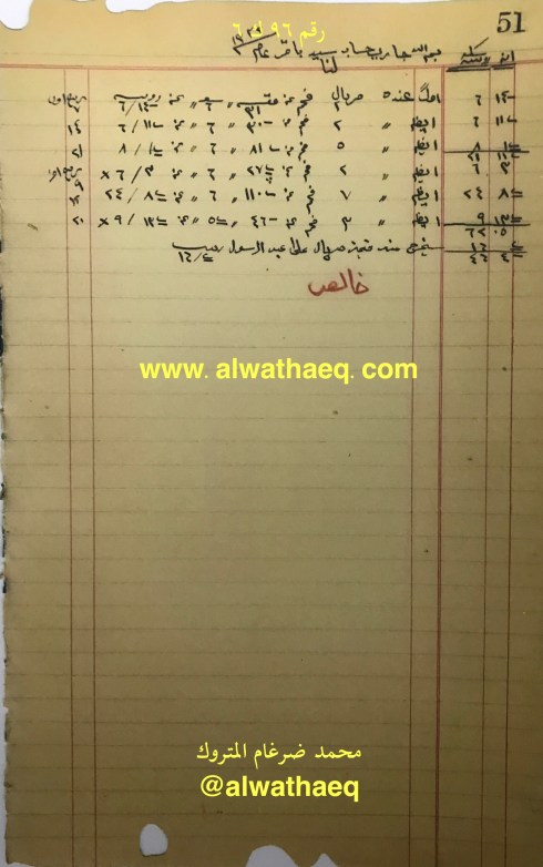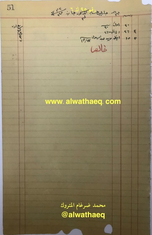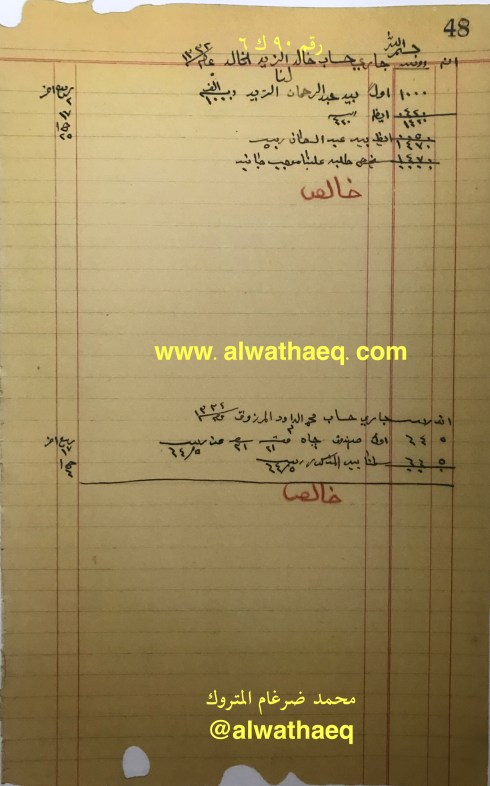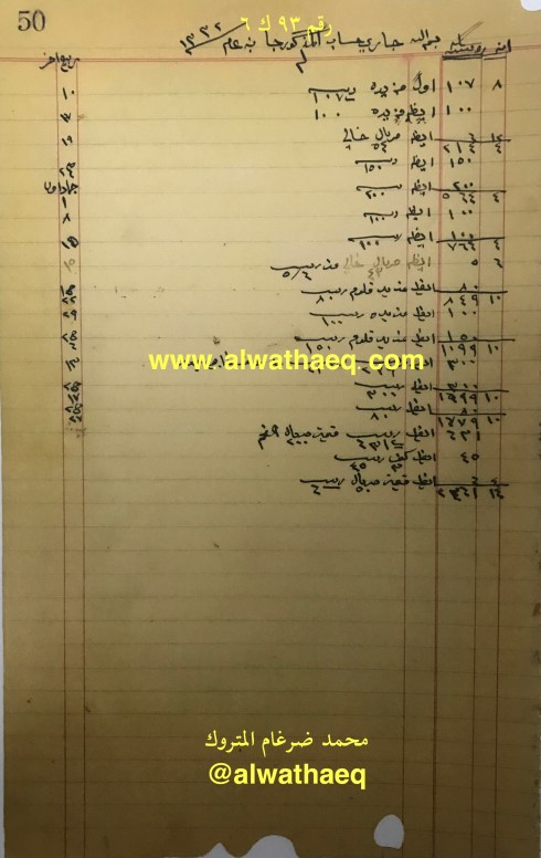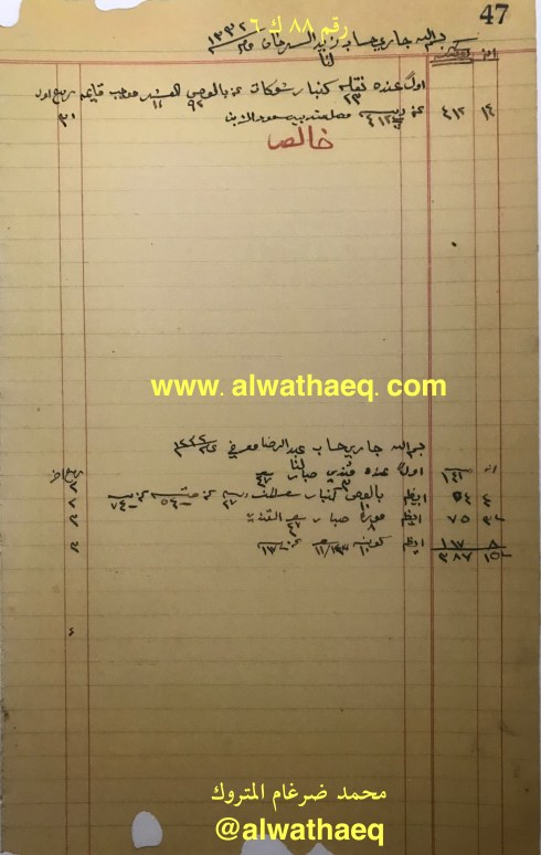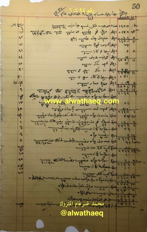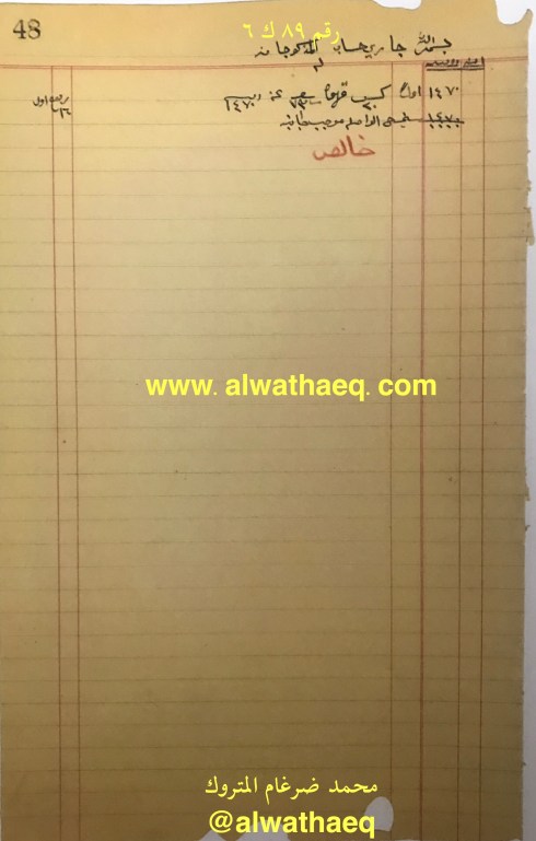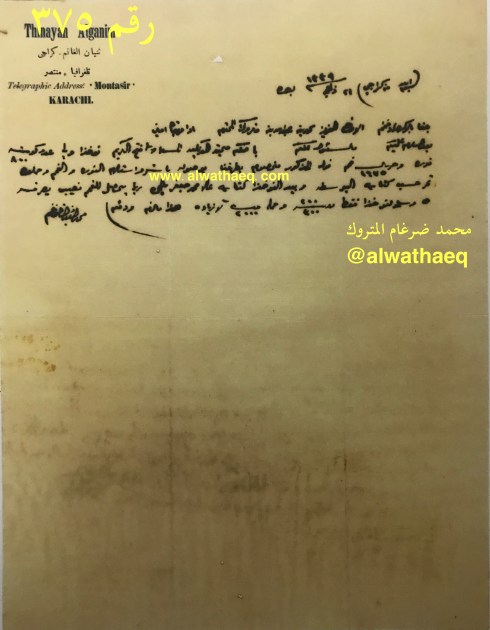 ومنها محمد ثنيان الغانم يرسل من كراتشي الى محمد عبدالله المتروك في البصرة عدد ٢٠٠ كونية نوره و ١٦٧٥ صربال فحم ويريد تحميل الكوتيه المسماة فتح الكريم عند تنزيل البضايع تمر .