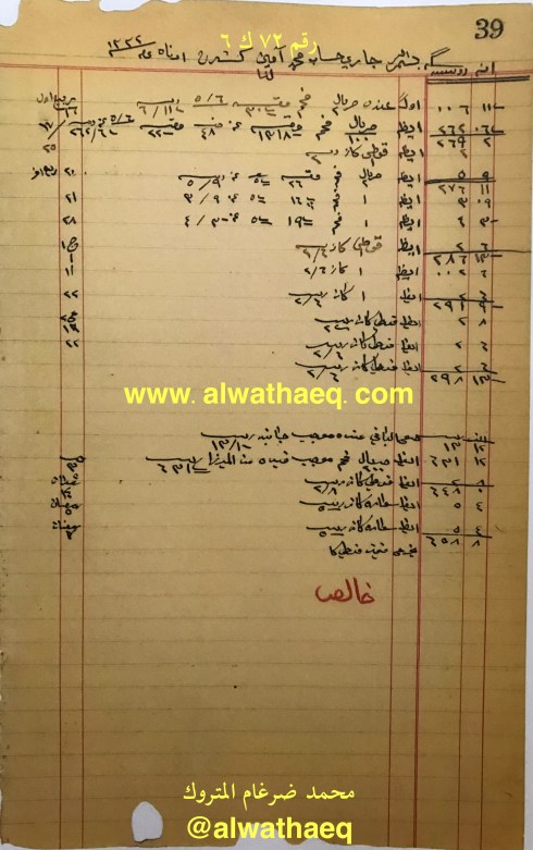 قائمة الحساب الاخ خالد بن فايز بن خميس المتحمل من بندر كاليكوت في مركب تياله و براله و بروده بعلامة KF المتباع على سيد ياسين