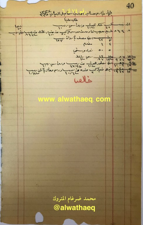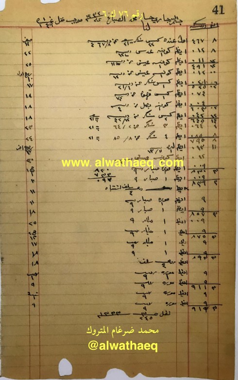 ٤٨ كيس شكر / و رواسي ١٠ ربيه / ٥٠ كيس عن ١٠٠ هندر / مصرف باردان / ٦ ربيه و ٤ انه مقدم / نول وستمي / سعي / مصلحة العيش / رسم و حمال باشي