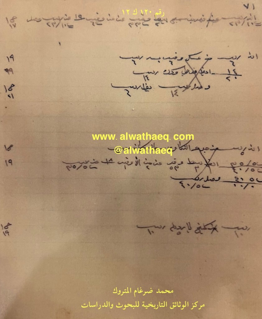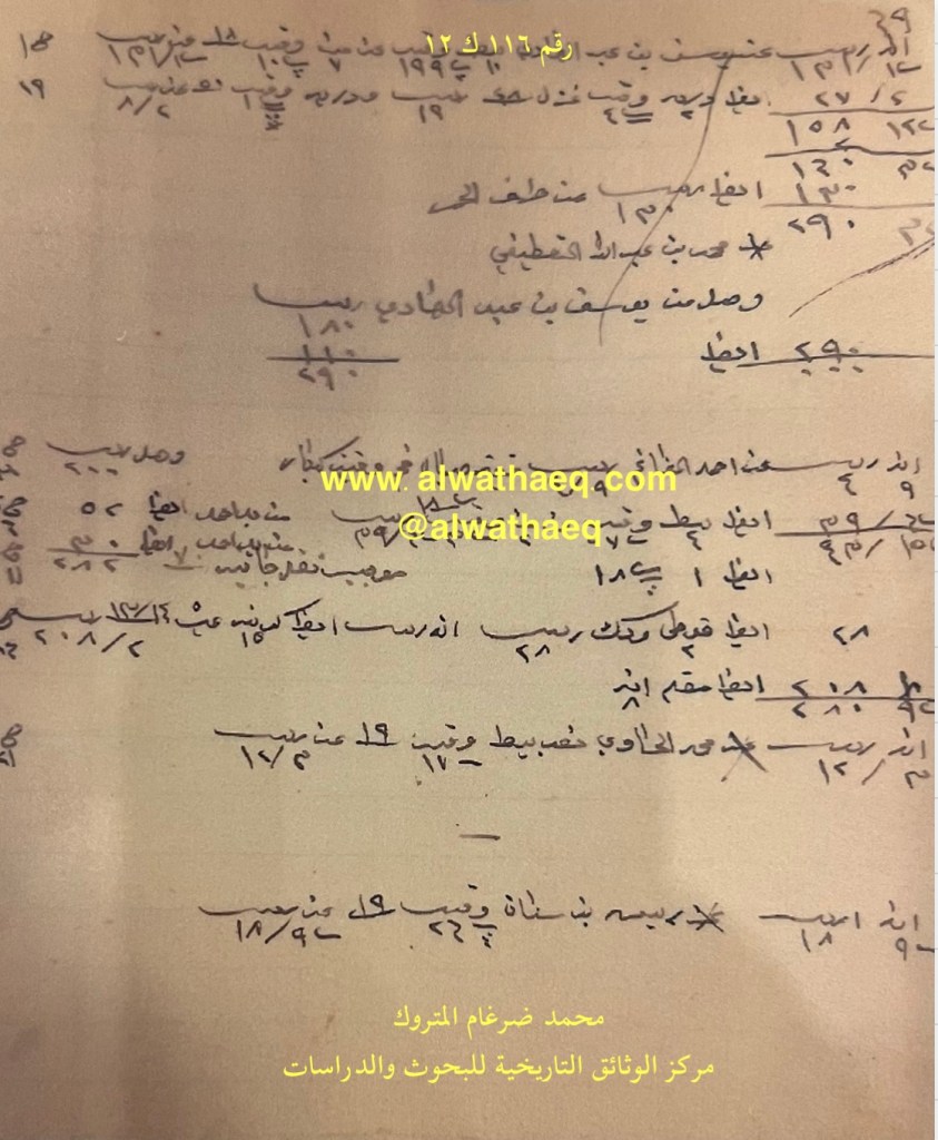 كشف حساب سنة ١٩١٣ م من دفاتر التاجر محمد بن عبدالله المتروك الاسماء التي ذكرت🚩: راشد بن فرحان / فهد الحساوي / عبدالعزيز بن نصرالله / صقر من البضائع التي ذكرت 🚩: بيطه ( وقيه ) / صف / بي ( وقيه ) العملات المتداولة🚩: ربيه / آنه وثيقة رقم ( ١٢٣ ك ١٢ )🚩: . ✏️شرح وتعليق / محمد ضرغام المتروك . الوثائق التاريخية للبحوث والدراسات