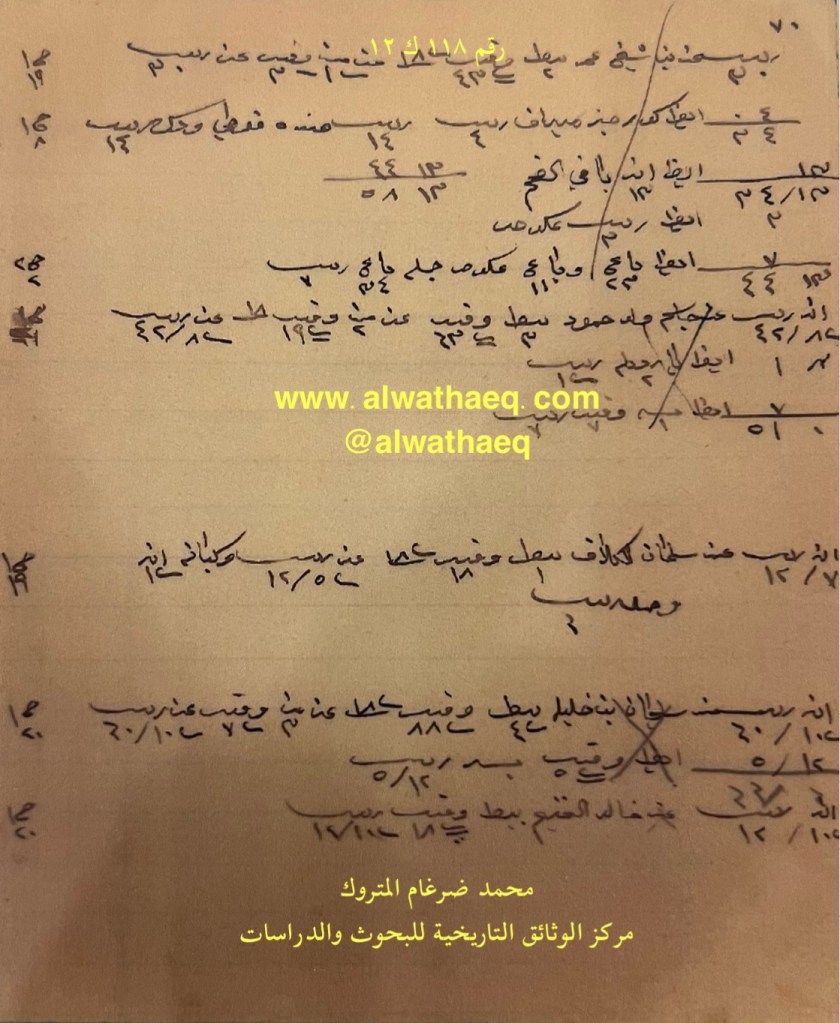 كشف حساب سنة ١٩١٣ م من دفاتر التاجر محمد بن عبدالله المتروك الاسماء التي ذكرت🚩: يوسف بن عبدالهادي / الحمر / محمد بن عبدالله القطيفي / احمد الغانم / محمد الحساوي / ربيعه بن سنان
