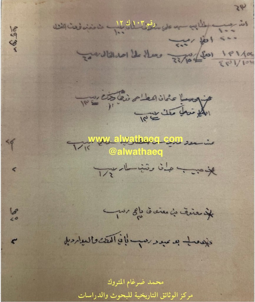 كشف حساب سنة ١٩١٣ م من دفاتر التاجر محمد بن عبدالله المتروك الاسماء التي ذكرت🚩: زعيل بن رومي / عبدالله بن حسن / سعيد العطيبي / راشد ولد ابراهيم برشود ( الرشود ) / محمد بن حقان / علي العجمي / عيسى مجيمي ( المكيمي ) / سعد الحمار / صالح بن جوهر / جاسم الدبوس / يعقوب معيلي / عبدالله سليمان / بن حكان / ولد عبداللطيف بن عيسى
