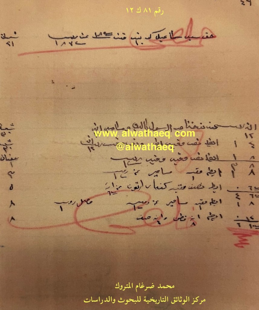كشف حساب سنة ١٩١٣ م من دفاتر التاجر محمد بن عبدالله المتروك الاسماء التي ذكرت🚩: مهدي بن حنتوش الاماكن التي ذكرت🚩: من البضائع والمعاملات التي ذكرت 🚩: فحم ( صربال ) / سحاره العملات المتداولة🚩: ربيه / آنه وثيقة رقم ( ٨٧ ك ١٢ )🚩: . ✏️شرح وتعليق / محمد ضرغام المتروك . الوثائق التاريخية للبحوث والدراسات