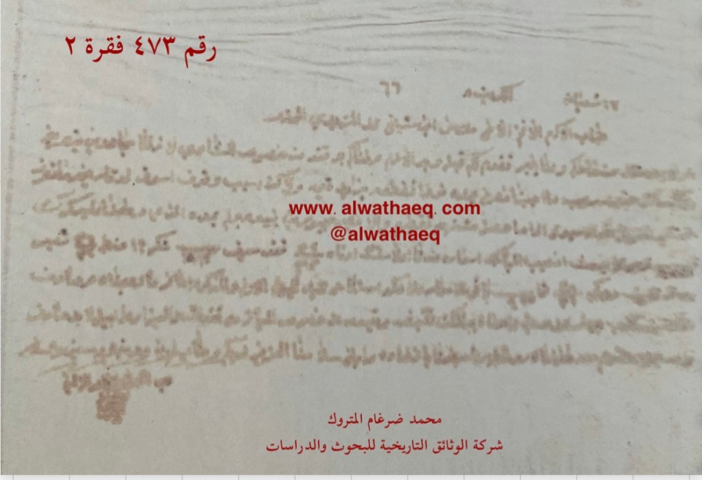 رسالة سنة ١٩٣٠ م من محمد عبدالله المتروك وعبدالمحسن الخرافي (توقيع) محمد المتروك الى موسى ابن الشيخ محمد المزيدي (الكويت) الاماكن التي ذكرت🚩: الكويت / السوق من البضائع التي ذكرت🚩: شاهي / قند / شكر / حنطه / شعير العملات المتداولة🚩: ربيه مضمون الرسالة🚩: معاملات تجارية في المواد الغذائية وثيقة رقم( ٤٧٣ فقرة ٢ )🚩: . ✏️شرح وتعليق / محمد ضرغام المتروك . الوثائق التاريخية للبحوث والدراسات