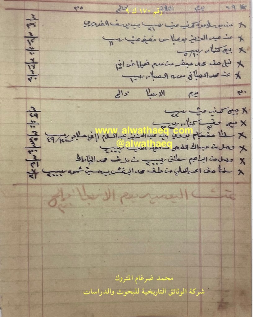 كشف حساب سنة ١٩١٧ م من دفاتر التاجر محمد بن عبدالله المتروك الاسماء التي ذكرت🚩: بوسلاموه / يوسف الفودري / عبدالعزيز بوعباس / محمد جعفر ( الكعبي ) / محمد الصباغ / جاسم بودي / عبدالعزيز عبدالسلام / عبدالله الفرج / ابراهيم اسحاق / محمد الجارالله / عمر العلي / محمد البرغش / حسين شموه من البضائع والمعاملات التي ذكرت 🚩: كونيه عيش / نصيفه عيش / كنبار / تيل حق محمد جعفر عن عدم تحميل التمر ١٥ انه / موره صبار / وصل من عبدالله الفرج من قيمة العيش ٤٠٠٠ ربيه / وصل من ابراهيم اسحاق ٢٠٠٠ ربيه من طرف محمد الجارالله / سلمنا حق اعمر العلي من طرف محمد البرغش بيد حسين شموه ٢٠٠٠ ربيه العملات المتداولة🚩: ربيه / انه وثيقة رقم ( ١٧٠ ك ٩ )🚩: . ✏️شرح وتعليق / محمد ضرغام المتروك . الوثائق التاريخية للبحوث والدراسات