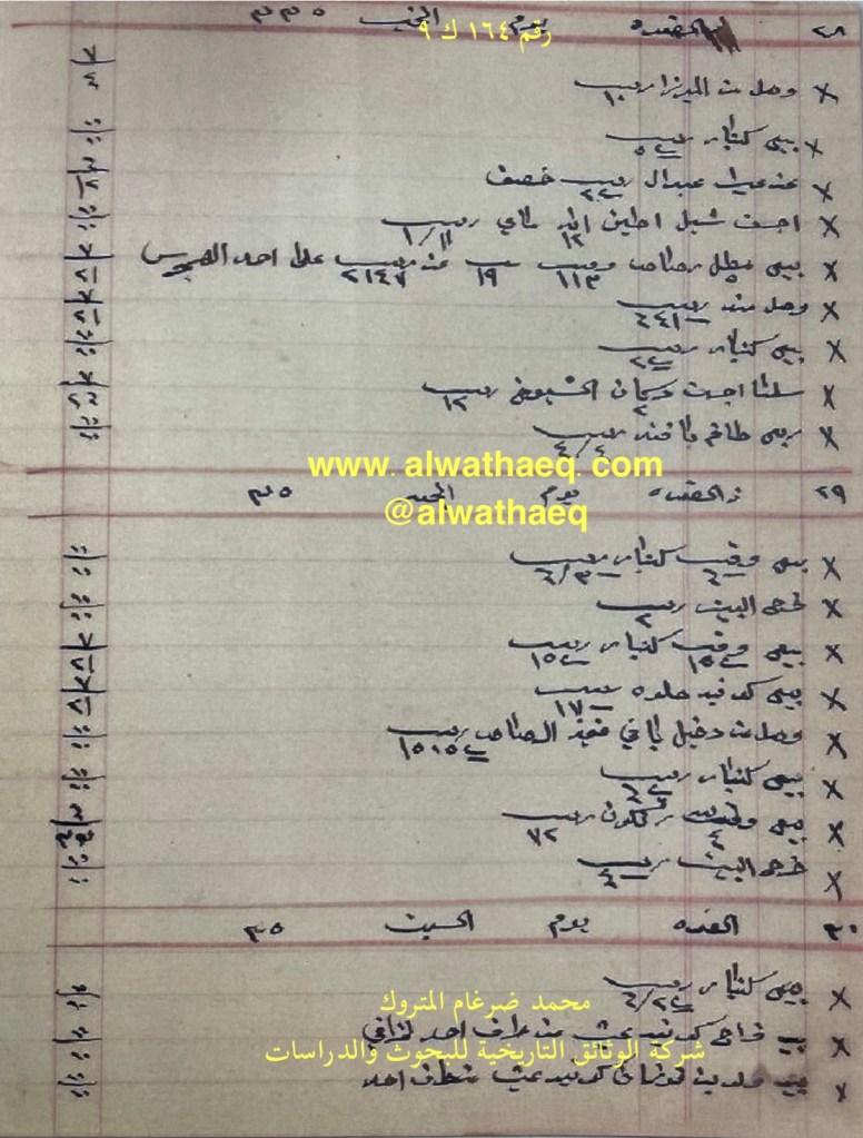 كشف حساب سنة ١٩١٧ م من دفاتر التاجر محمد بن عبدالله المتروك الاسماء التي ذكرت🚩: الشامي / ابراهيم / فهد الدريجي ( الطريجي ) / سليمان بن بدر / جاسم الغانم / عبدالمحسن الخريفي / عبدالمحسن الخرافي / ابراهيم بن عبدالعزيز / سلوم / يوسف بودي / حسين بن عبود / عبدالرزاق بن اسماعيل / خالد بن فايز بن خميس / ناصر الخرافي / الفضل / لالجي / حسين بن ناصر / موسى / سعد بن عيسى / نوخذه سباهي / طويك ( طويج ) الاماكن التي ذكرت🚩: الدكان من البضائع والمعاملات التي ذكرت 🚩: ١٠٠ كونيه عيش / ٧٠ كونيه / ٦٠ كونيه / الداخله للدكان ١٧١ كونيه عيش و ٤٥ حنطه / تيل ١١ انه / تفريج الحنطه و العيش / ٥ انه رطب / حواله ٢٠،٠٠٠ الف ربيه / ٢٠ ربيه سلف العملات المتداولة🚩: ربيه / ربيه انواط / انه / ليره ملاحظة🚩: ذكر في الوثيقة عبدالمحسن الخريفي وقد يكون المقصود عبدالمحسن الخرافي وهي الاقرب والله اعلم وثيقة رقم ( ١٥٦ ك ٩ )🚩: . ✏️شرح وتعليق / محمد ضرغام المتروك . الوثائق التاريخية للبحوث والدراسات
