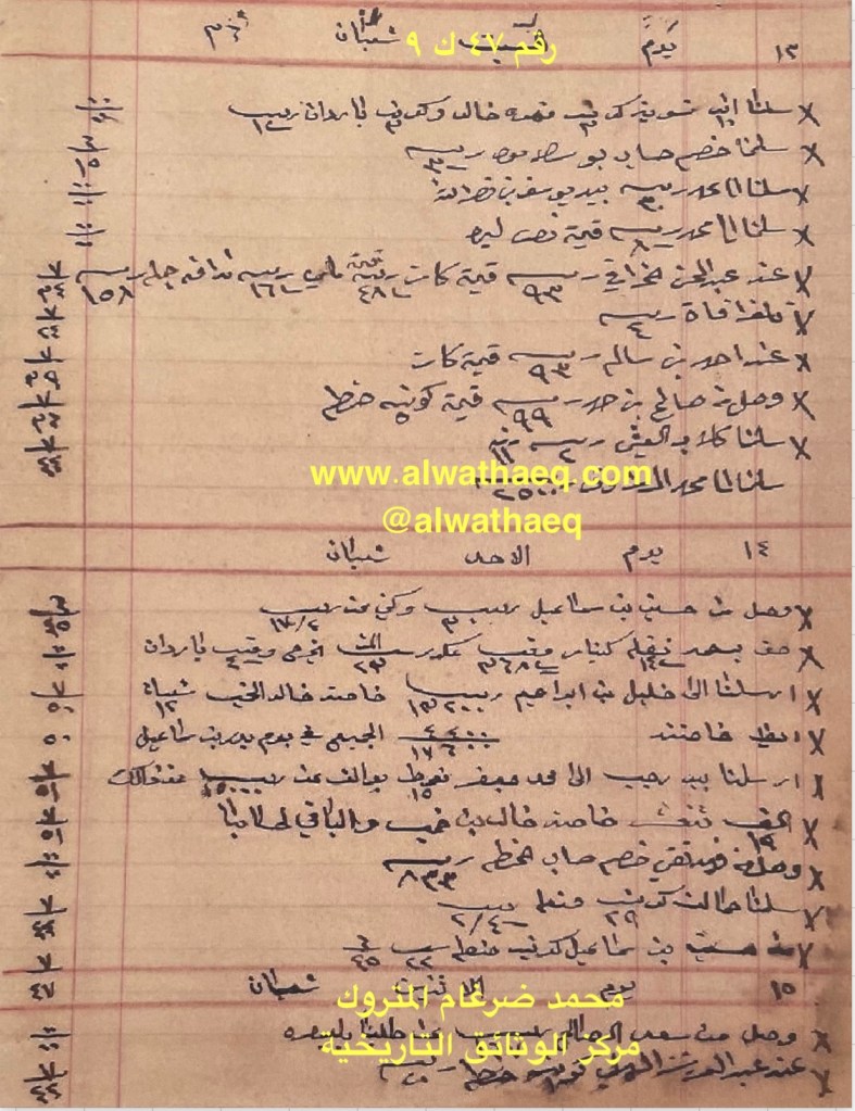 كشف حساب سنة ١٩١٨ م من دفاتر التاجر محمد بن عبدالله المتروك . الاسماء التي ذكرت🚩: داوود البدر / معيوف / ولد توفوني ( تيفوني ) / ولد بوحمد / عبدالعزيز الحساوي / عبدالعزيز الصراف / محمد المرزوق / جاسم / مشعان / حسين بن عيسى / محمد بن عثمان / محمد الجارالله / جاسم بوهدور / خالد بن خميس / عبدالحسين بوعباس / الوالده / يوسف العبداللطيف الفرج / حسين عبداللطيف / سيد / حسين / جاسم الصراف / حسين بن اسماعيل . الاماكن التي ذكرت🚩: الدكان / بخار . من البضائع والمعاملات التي ذكرت🚩: نصيفه عيش / كونيه حنطه / ٥٨ كنبار بالوص / دلالة ١٠٠٠ كونية عيش / ٥٠٠ ليره / ١٠٠ ليره / ٢٠٠ ليره / وصل من عبدالحسين بوعباس ٥١ ربيه قيمة الهيل من طرف الوالده / اجرة دكان الشكر ١٠ ربيه / حواله / ٦٠٢٠ ربيه عن قيمة ٥٠٠ ليره / ١٤٤٠ ربيه عن قيمة ١٠٠ ليره / سلمنا نطارة دكان و٢ بخار ٤ ربيه / كيس شكر . العملات المتداولة🚩: ربيه / ليره . وثيقة رقم ( ٤٨ ك ٩ )🚩: . ✏️شرح وتعليق / محمد ضرغام المتروك رئيس مركز الوثائق التاريخية
