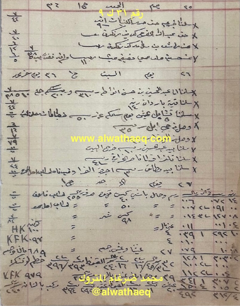 كشف حساب سنة ١٩١٨ م من دفاتر التاجر محمد بن عبدالله المتروك . الاسماء التي ذكرت🚩: بوسلاموه / علي مخيزيم / مبارك بن صانع / عبدالله الابراهيم سمكه ( المعجل ) / بن عصفور / محمد الصباغ / نجم / عبدالحسين بن حسن ( الكاظمي ) / عبدالرزاق بن صالح . من البضائع والمعاملات التي ذكرت🚩: عيش / صبار / ٣٤٥ ربيه باقي نول البوم / ٤ انه حماله / تفريج مركب لينك / تراز . السفن التي ذكرت🚩: مركب لينك / بوم . العملات المتداولة🚩: ربيه سكه / ربيه انواط / انه . وثيقة رقم ( ٣٠ ك ٩ )🚩: . ✏️شرح وتعليق / محمد ضرغام المتروك