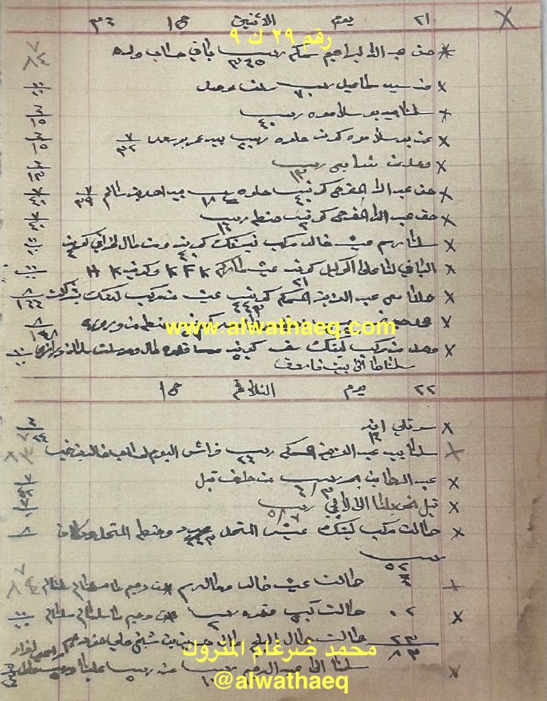 كشف حساب سنة ١٩١٨ م من دفاتر التاجر محمد بن عبدالله المتروك . الاسماء التي ذكرت🚩: عبدالله الابراهيم السمكه ( المعجل ) / سيد اسماعيل / بوسلاموه / عمر بوسعد / شايع / عبدالله الفرج / احمد بن سالم ( الخشتي ) / خالد / الخرافي / الوكيل / عبدالعزيز السمكه ( المعجل ) / محمد جعفر ( الكعبي ) / سلمان الدرازي / بيت فاروق / خالد بن خميس / عبدالرحمن بن بحر / لالجي / دحيم / حسين بن شيخ علي ( اليوسف ) / عبدالرحيم . الاماكن التي ذكرت🚩: بيت فاروق / الدكان . من البضائع والمعاملات التي ذكرت🚩: سيد اسماعيل ٧٠ ربيه سلف / كونيه حلوه / ٤٠ كونيه حلوه / ٢ كونيه حنطه / ٤٠ كونيه عيش / الباقي لنا على الوكيل ٢١ كونيه عيش ماركه KFK وكوريه HK حملنا مع عبدالعزيز السمكه ٤٤٣ كونيه عيش من مركب لنك بشراكة / ٥٧ كونيه حنطه / وصل من مركب لينك سفر ٥٠ كونيه قهوه مال ومرسلة سلمان الدرازي سلمناها الى بيت فاروق / سوتلي / سلمنا بيد عبدالعزيز السمكه ٢٦ ربيه فراش البوم لحساب خالد بن خميس / حمالة مركب لينك عيش المتحمل عدد ٤٤٣ وحنطه المتحمل ودكان / ٥٠ كيس قهوه / حمالة البلم مال حسين بن شيخ علي ( اليوسف ) اخو دحيم . السفن التي ذكرت🚩: مركب لينك / مركب نيرنك / البوم / مركب وروره / بلم حسين بن شيخ علي ( اليوسف ) . العملات المتداولة🚩: ربيه / انه . وثيقة رقم ( ٢٩ ك ٩ )🚩: . ✏️شرح وتعليق / محمد ضرغام المتروك