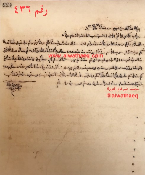 ومنها الحاج محمد يبلغ الحاج عبدالله ويبدو انه في الهند ان اذا سلم لهم خالد بن خميس المبلغ وهنا المبلغ خاص ل محمد المتروك ياخذ له مقابله شماغ ازرق ويقدمه الى المحمرة ( المكتب التجاري التابع للحاج محمد المتروك ) عن يد محمد جعفر ( الكعبي ) واذا لم يجد الشماغ ياخذ بداله چاه ( شاي ) ويبدو ان الشماغ الأزرق كان عليه طلب آنذاك في المحمرة ( خرمشهر ) ويختم في الرسالة ان يوصل السلام الى خالد بن خميس وان يسلمه طيه كتاب .